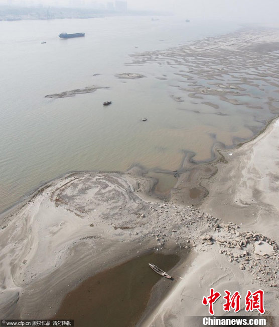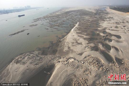 12月7日,在長江武漢市天興洲水域,大量沙洲露出江面,形成大大小小的沙丘,分布在水岸。據悉,近期,由于長江中下游地區持續多日的干燥少雨的天氣,長江漢口水位接近枯水期的標植。
