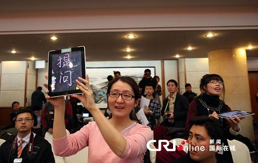2011年3月5日,廣東代表團(tuán)開放,兩位來自廣東媒體的女記者,手拿著ipad舉手提問,ipad上寫著“提問”兩個字。她們希望能引起新聞官的注意,被點(diǎn)名叫到提問。