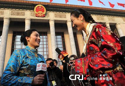 2011年3月5日,北京,青海電視臺的來忠(右)慕名而來,與啟米翁姆(左)一段藏語交談后親如姐妹。當(dāng)日,來自四川的康巴衛(wèi)視的藏族女主播啟米翁姆在人民大會堂前一站,就再次受到代表和記者的關(guān)注。