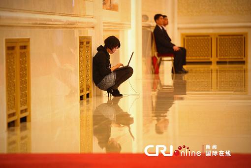 北京,在人民大會堂金色大廳舉行的政協(xié)新聞發(fā)布會上,一名女記者蹲坐著工作