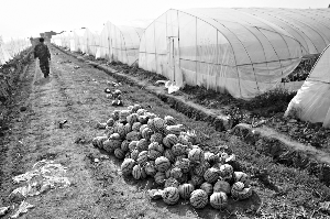 5月13日,在劉明鎖承包的西瓜田邊堆積了大量未熟先爆裂的西瓜