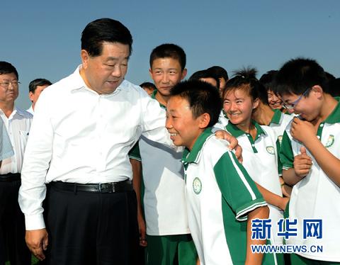 8月29日至30日,中共中央政治局常委、全國政協主席賈慶林在內蒙古鄂爾多斯調研。這是8月29日,賈慶林在億利東方學校親切看望正在上體育課的孩子們。中共中央政治局常委、全國政協主席賈慶林在內蒙古鄂爾多斯調研。這是8月29日,賈慶林來到沙漠牧民新村蒙古族牧民家中做客并詢問生產生活情況.
